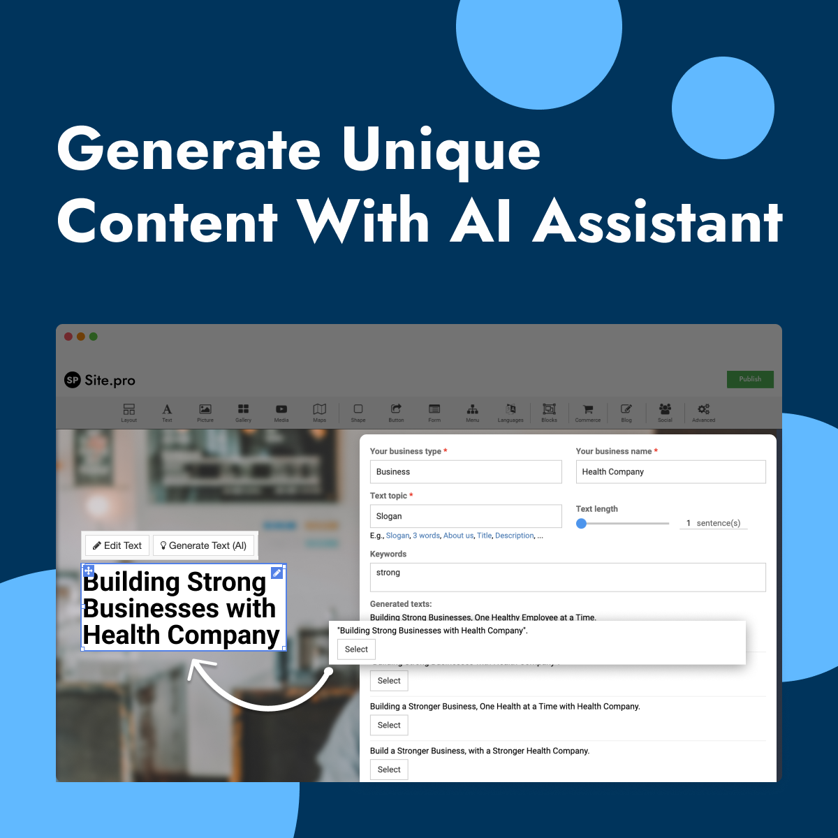 - Если кнопка «Генерировать текст (И)» не появляется, подождите пару минут и перезагрузите страницу Конструктора веб-сайтов.